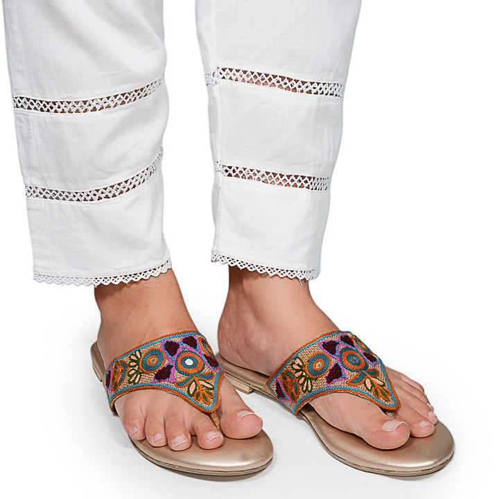 FL-SJ13-Fawn represents a prime example of delightful, opulent, and time-honored craftsmanship showcased in elegant flats adorned with exquisite machine embroidery. These flats stand as cherished cultural legacies of Pakistan, meticulously stitched by dedicated rural shoemakers to showcase the unparalleled beauty of captivating feet.
