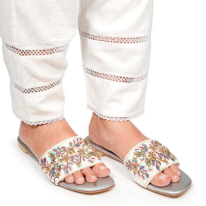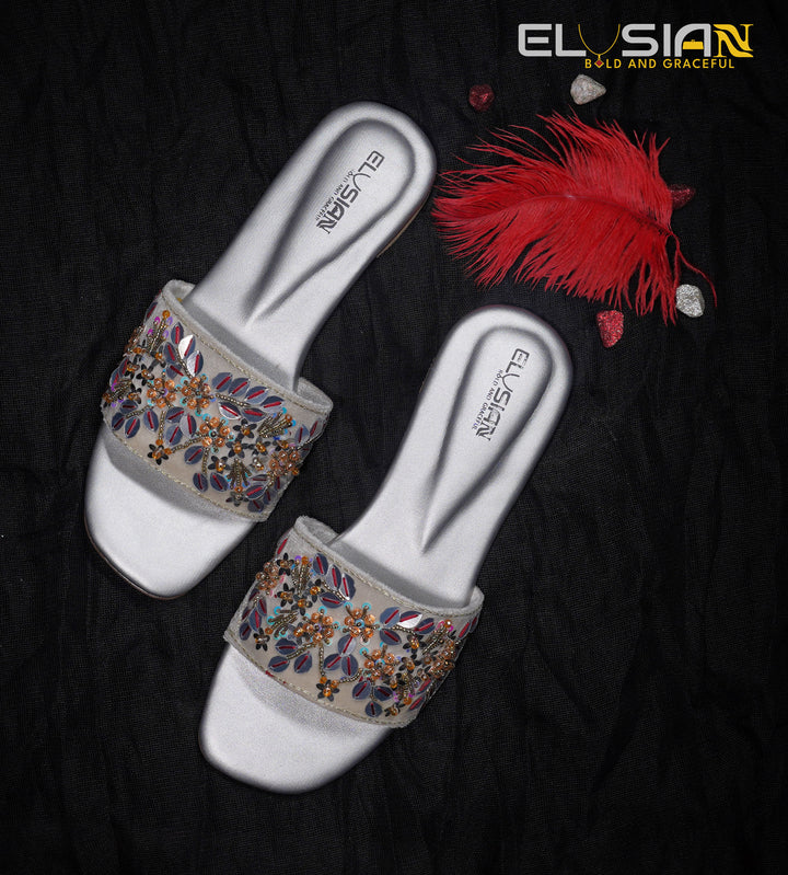 FL-TQ1-SteelGray represents a prime example of delightful, opulent, and time-honored craftsmanship showcased in elegant flats adorned with exquisite handmade detailing. These flats stand as cherished cultural legacies of Pakistan, meticulously stitched by dedicated rural shoemakers to showcase the unparalleled beauty of captivating feet.