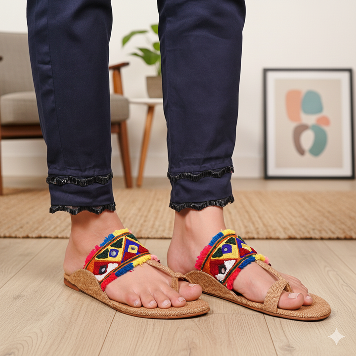 KL-SJ1-Fawn represents a prime and outstanding example of Kolhapuri footwear, characterized by its delightful, opulent, and traditional craftsmanship. Crafted on a foundation of fawn jute, these shoes showcase intricate handmade embellishments. These remarkable creations are cherished cultural artifacts of Pakistan, meticulously stitched by dedicated cobblers from rural communities, showcasing the unparalleled elegance designed to adorn and enhance the allure of one’s feet.