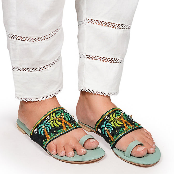 KL-WS1-Aqua represents a prime and outstanding example of Kolhapuri footwear, characterized by its delightful, opulent, and traditional craftsmanship. Crafted on a foundation of black jute, these shoes showcase intricate handmade embellishments. These remarkable creations are cherished cultural artifacts of Pakistan, meticulously stitched by dedicated cobblers from rural communities, showcasing the unparalleled elegance designed to adorn and enhance the allure of oneβs feet.