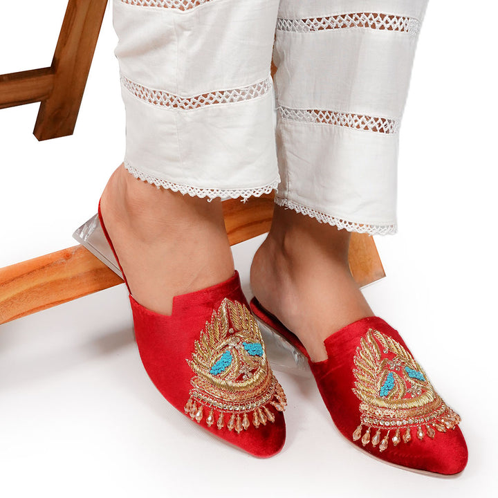 ML-AE3-Mighty-Moon--Red-(Heel) stands as a true embodiment of delightful, opulent, and timeless artistry, crafted upon a rich red velvet foundation and adorned with a captivating blend of intricate embroidery. These treasured symbols of Pakistan’s heritage are meticulously hand-sewn by dedicated shoemakers from rural regions, proudly showcasing the exquisite allure of captivating feet.