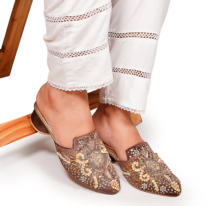 ML-AQ1-Brown-(Heel) stands as a true embodiment of delightful, opulent, and timeless artistry, crafted upon a rich brown velvet foundation and adorned with a captivating blend of intricate embroidery. These treasured symbols of Pakistan’s heritage are meticulously hand-sewn by dedicated shoemakers from rural regions, proudly showcasing the exquisite allure of captivating feet.