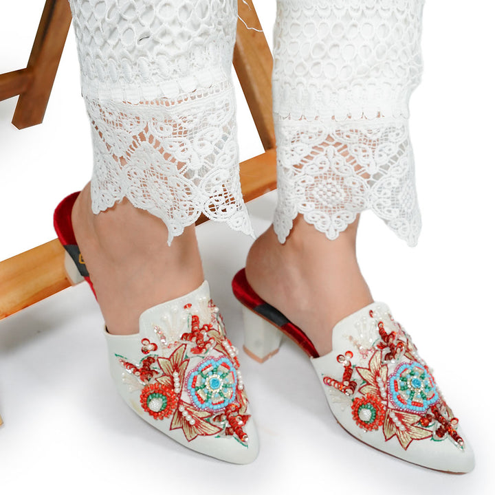 ML-Q3-O.White-(Heel) stands as a true embodiment of delightful, opulent, and timeless artistry, crafted upon a rich off white foundation and adorned with a captivating blend of intricate embroidery. These treasured symbols of Pakistan’s heritage are meticulously hand-sewn by dedicated shoemakers from rural regions, proudly showcasing the exquisite allure of captivating feet.