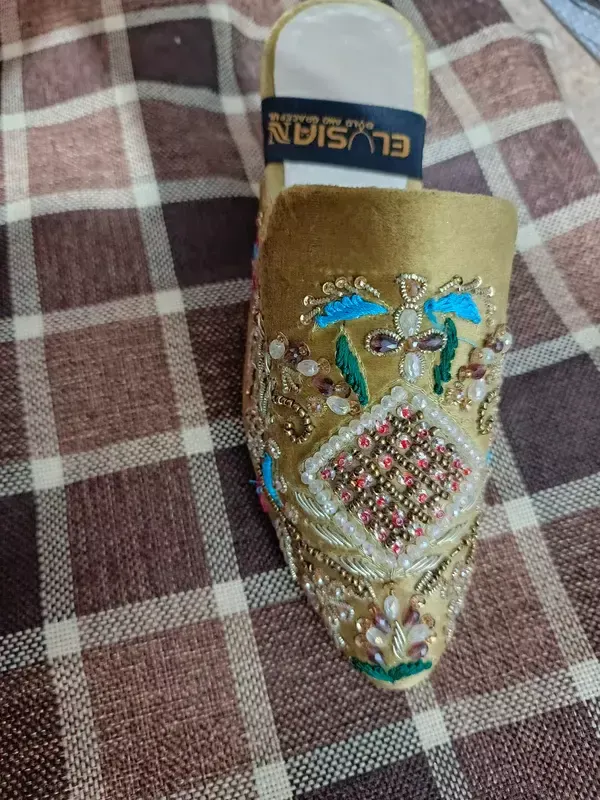 ML-S7-Golden embodies delightful, opulent, and timeless artistry, crafted upon a rich golden foundation and adorned with a captivating blend of intricate embroidery. These treasured symbols of Pakistan’s heritage are meticulously hand-sewn by dedicated shoemakers from rural regions, proudly showcasing the exquisite allure of captivating feet.