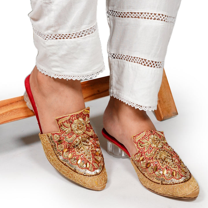 ML-SJ1-Golden stands as a true embodiment of delightful, opulent, and timeless artistry, crafted upon a rich Golden foundation and adorned with a captivating blend of intricate embroidery. These treasured symbols of Pakistan’s heritage are meticulously hand-sewn by dedicated shoemakers from rural regions, proudly showcasing the exquisite allure of captivating feet.