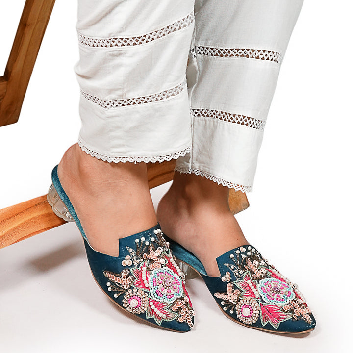 ML-WS5-Teal stands as a true embodiment of delightful, opulent, and timeless artistry, crafted upon a rich blue foundation and adorned with a captivating blend of intricate embroidery. These treasured symbols of Pakistan’s heritage are meticulously hand-sewn by dedicated shoemakers from rural regions, proudly showcasing the exquisite allure of captivating feet.